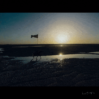 Crossing the horizon on horseback in a perfect, silent arc.