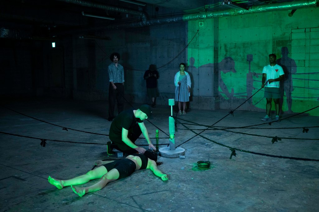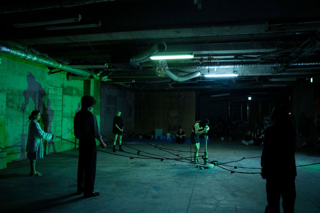The performance begins with a re-envisioned act of wudu, the Islamic ablution ritual. Instead of water, a neon green liquid is used—its unnatural fluorescence suggesting both ritual purification and the contamination of trauma. The performer methodically washes her face, arms, and feet, each movement imbued with both inherited ritual and contemporary crisis.