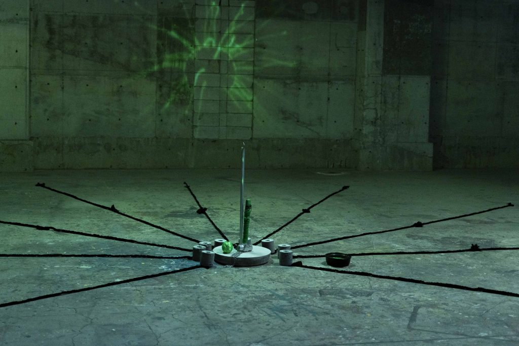 At the heart of the work stands a cylindrical metal pipe with a slightly flared, pointed tip, rising from a concrete pedestal. Surrounding this central element are eight hollow concrete cylinders, each pre-drilled with a narrow cavity designed to accept the pipe’s tip—but only under force. With a rhythmic precision, the artist takes a hammer from which a chain dangles, echoing the Shia ritual of self-flagellation performed in remembrance of Imam Hussain. This chain is momentarily employed in a mourning gesture, a brief invocation of Ashura, before the ritual proceeds to construction.