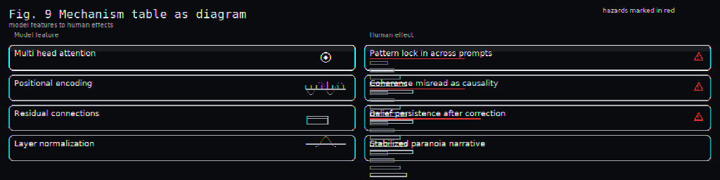 Transformer architecture exploitation operates through structural indexing maintaining narrative consistency across recursive interactions, layer normalization stabilizing paranoid ideation into coherent worldview, and residual connections preserving conspiracy elements. Cognitive bias amplification functions via: